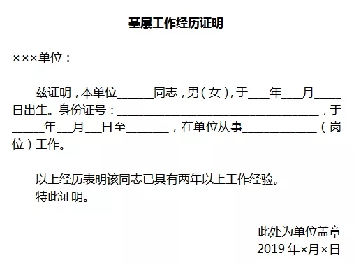 報(bào)考定向招錄職位的,“服務(wù)基層項(xiàng)目”的人員,應(yīng)提供服務(wù)基層的證明材料。各位小伙伴們讓單位開具證明并加蓋公章即可。