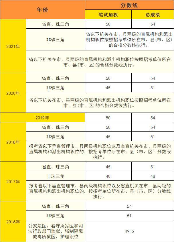 廣東省2021年考試錄用公務(wù)員筆試科目加權(quán)合格分?jǐn)?shù)線為50分,考試總成績(jī)合格分?jǐn)?shù)線為54分。省以下機(jī)關(guān)在市、縣兩級(jí)的直屬機(jī)構(gòu)和派出機(jī)構(gòu)職位按照招考單位所在市、縣(市、區(qū))的合格分?jǐn)?shù)線執(zhí)行。