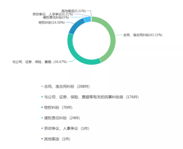 最多的一級案由為合同、準合同糾紛,其下最多的案由為委托理財合同糾紛;第二類是與公司、證券、保險、票據(jù)等有關(guān)的民事糾紛類;第三類為物權(quán)糾紛,其下案由全部為財產(chǎn)損害賠償糾紛,其本質(zhì)上屬侵權(quán)責任糾紛;此外還有20%左右的案件直接納入侵權(quán)責任糾紛。