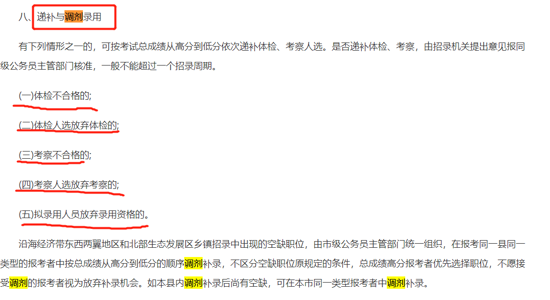 公告截圖可以看出:除了體檢不合格,放棄體檢,資審不合格,放棄資審和錄用人員放棄錄用資格能有遞補機會外,如有空缺職位還存在遞補調(diào)劑機會。