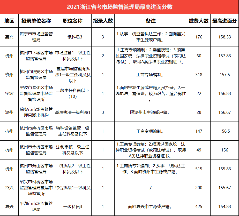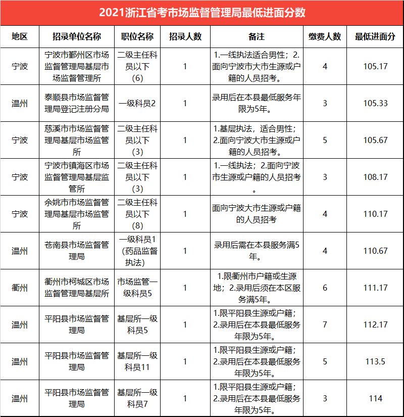 下表是2021浙江省考中市場監(jiān)督管理局最低進面分后十職位,半數(shù)招錄單位來自溫州。