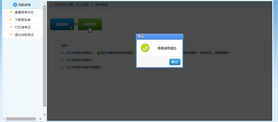 考生填寫個人的報考信息后,點擊“保存”按鈕后,提示保存成功,可跳轉到報考流程頁面,如下圖所示: