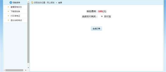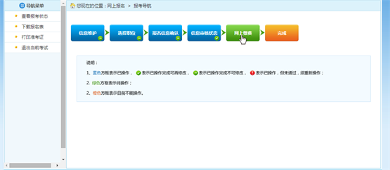 審核通過的考生可以進行網(wǎng)上繳費,點擊報考流程中“網(wǎng)上繳費”選項,可以進入網(wǎng)上繳費的頁面,如下圖所示: