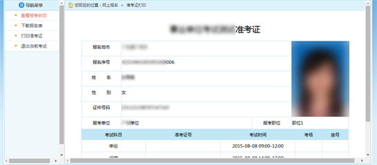 通過點擊系統(tǒng)導航菜單的“打印準考證”選項,可進入準考證打印頁面,如下圖所示: