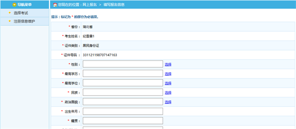 通過(guò)點(diǎn)擊接受按鈕,進(jìn)入考生填寫報(bào)名信息的頁(yè)面,如下圖所示: