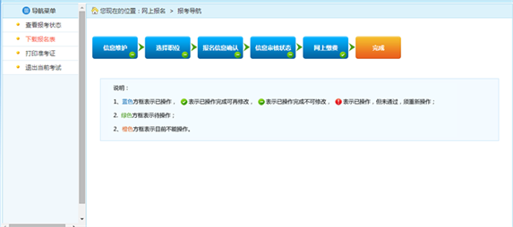 通過(guò)點(diǎn)擊“確認(rèn)”按鈕,提示確認(rèn)成功后跳轉(zhuǎn)到報(bào)考流程頁(yè)面。進(jìn)入審核狀態(tài),等待管理員進(jìn)行資格審核。