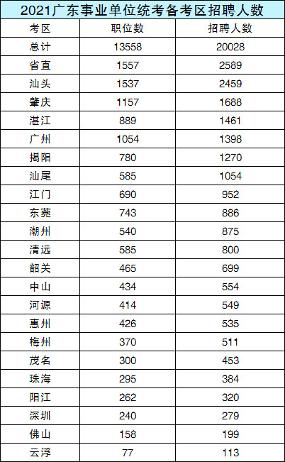 2021年全省職位數(shù)13558個,共招20028人。其中,綜合崗招5702人,醫(yī)療崗10354人,教師崗招3972人,相比2020年,醫(yī)療崗招人大幅增加!2021年省直招考人數(shù)最多,共招2589人,其實是汕頭,有1537個職位數(shù),招2459人,具體全省情況如下:
