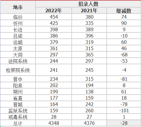 從2022山西省考招錄來看,臨汾市招錄人數(shù)最多,達到454人,超越去年的呂梁市穩(wěn)居榜首,招錄人數(shù)最少的依舊是戒毒系統(tǒng),僅招錄28人;從增減量來看,忻州、運城、朔州等地市逆勢上漲,監(jiān)獄系統(tǒng)降幅最大,比去年減少了一百多人,有地域選擇的考生可以參考上述數(shù)據(jù)。