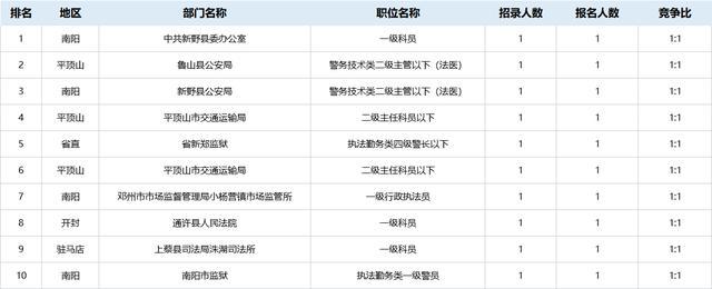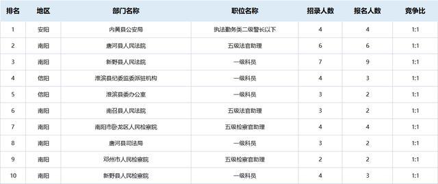 值得關(guān)注的是,目前競爭較低的十大崗位多分布于南陽(如下圖所示),多是一些檢察院和法院,因為報考法院和檢察院系統(tǒng)部分崗位需要取得《法律職業(yè)資格證書》A證,條件的限制,也讓很多考生“拒之門外”。