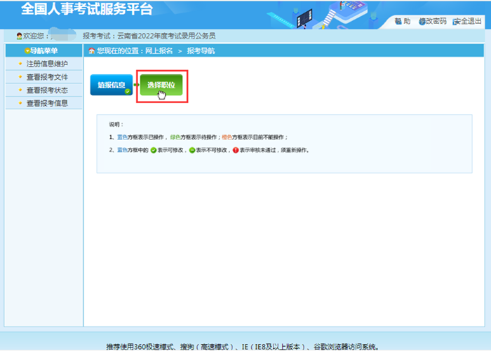 2.報(bào)考者應(yīng)認(rèn)真了解基本的政策和要求,仔細(xì)閱讀《招考簡(jiǎn)章》,結(jié)合自身?xiàng)l件,慎重選擇適合自己的招考職位。職位提交前請(qǐng)確認(rèn)個(gè)人信息是否按本人實(shí)際情況準(zhǔn)確填寫,如個(gè)人信息填寫與本人實(shí)際情況不一致需要修改,點(diǎn)擊“查看報(bào)考狀態(tài)”“信息維護(hù)”按鈕進(jìn)行修改。一旦進(jìn)行“報(bào)名信息確認(rèn)”操作后,將不能再修改報(bào)名信息和報(bào)考職位。