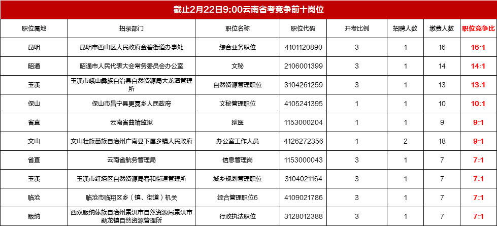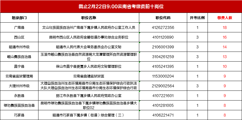 2022年云南公務(wù)員考試報名正在進行中,截至2月22日9:00,累計報名繳費:1247人,報名最高競爭比為16:1,無人報名繳費的崗位有:2066個。