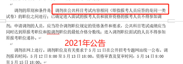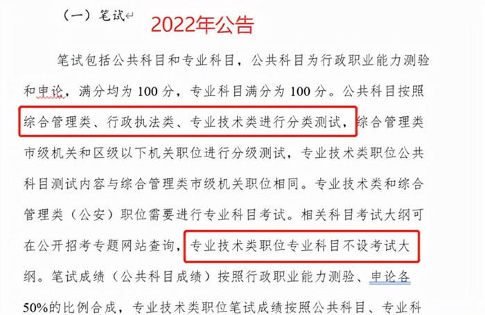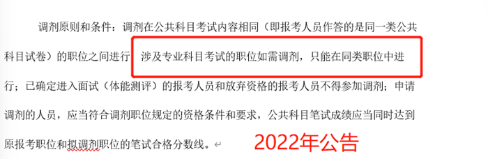 歷年招考公告中,沒有明確說明含專業(yè)科目考試的職位如何進(jìn)行,在2022年,涉及專業(yè)科目考試的職位如需調(diào)劑,只能在同類職位中進(jìn)行在公告中凸顯,你報(bào)考的崗位有專業(yè)測(cè)試,那你只能在同類崗位中調(diào)劑,也就是說你的專業(yè)成績(jī)將伴隨著你一路,所以,更要求考生盡可能的提高自己的各項(xiàng)能力,才能在后續(xù)的每個(gè)階段中贏得考試。