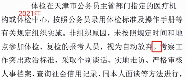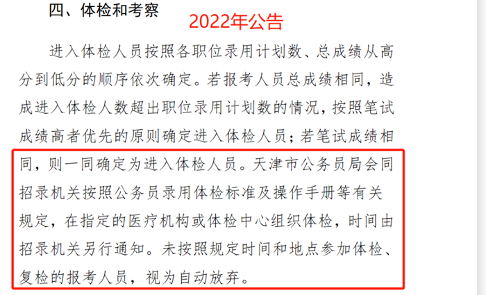 對(duì)比2021年公告,可以看出2022年天津體檢要求在指定的醫(yī)療機(jī)構(gòu)或體檢中心組織體檢,所以各位考生要注意一下招錄機(jī)關(guān)的通知,按照要求進(jìn)行體檢,不要自行體檢。