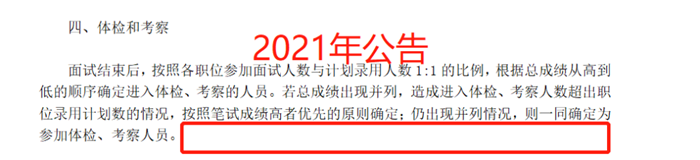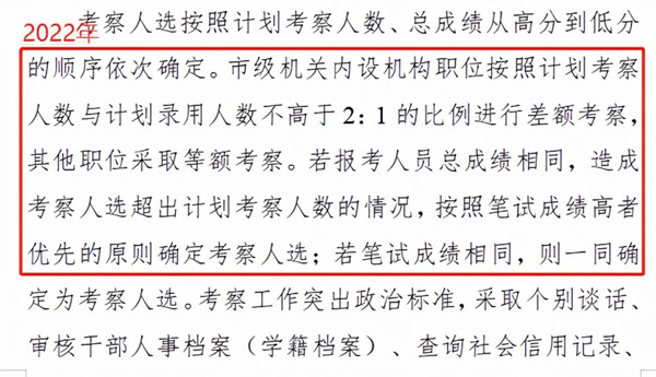 2022年公告中,在考察環(huán)節(jié)明確指出“市級(jí)機(jī)關(guān)內(nèi)設(shè)機(jī)構(gòu)職位按照計(jì)劃考察人數(shù)與計(jì)劃錄用人數(shù)不高于2:1的比例進(jìn)行差額考察,其他職位采取等額考察”。報(bào)考市級(jí)機(jī)關(guān)內(nèi)設(shè)機(jī)構(gòu)職位的同學(xué)一定要注意,進(jìn)入面試后還需要面臨考察。其次還明確指出“若總成績(jī)相同,造成考察人選超出計(jì)劃考察人數(shù)的情況,按照筆試成績(jī)高者優(yōu)先的原則確定考察人選”,可見筆試成績(jī)是尤為重要的,一定要重視筆試,在筆試成績(jī)上占優(yōu)勢(shì),后期才不會(huì)出現(xiàn)掉崗的情況。