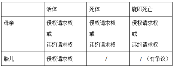 觀察此表格可知,針對胎兒的侵權(quán)依舊依照胎兒是否存活分為三種情況:1.胎兒分娩后為活體。此時母親可以以自己的名義提起侵權(quán)或違約之訴,同時胎兒也有自己獨(dú)立的訴求,可以向醫(yī)院主張侵權(quán),只不過該權(quán)利應(yīng)該由監(jiān)護(hù)人代為行使。2.胎兒分娩后為死體。該種情況胎兒無獨(dú)立的請求權(quán),僅母親以自己的名義主張侵權(quán)或違約。3.胎兒分娩出時為活體,很快死亡。此類情況在實(shí)踐中仍舊存在爭議,對于胎兒死亡后,留下的債權(quán)請求權(quán)是否可以被母親繼承現(xiàn)在法律仍沒有給出明確的答案,此問題不在考察的范圍內(nèi)。