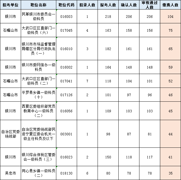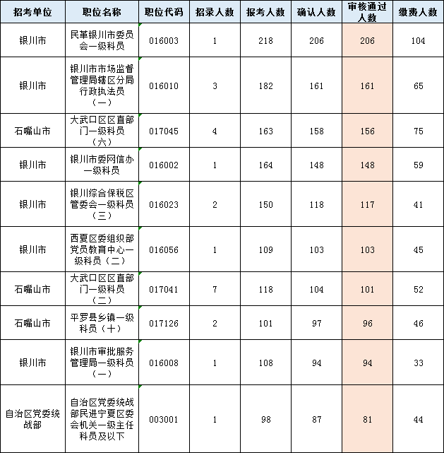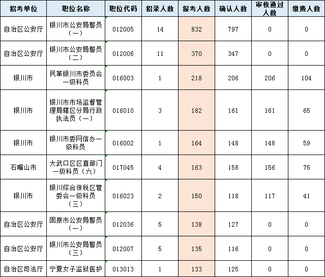 2022年寧夏公務(wù)員考試報(bào)名第三天,截止2月24日10:00,已有12766人報(bào)考,確認(rèn)人數(shù)11155人,7748人審核通過,3426人繳費(fèi),58個(gè)崗位無人報(bào)考。具體數(shù)據(jù)詳見附件: