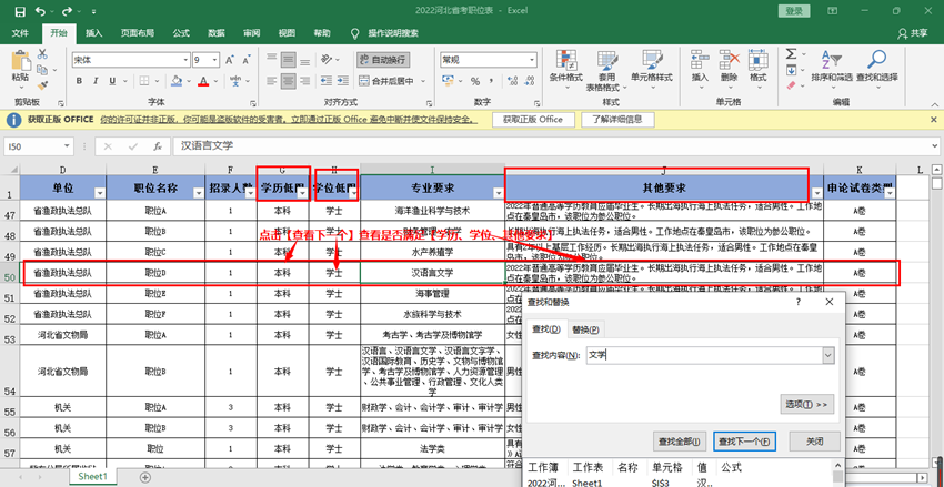 考生在篩選完基本條件后,還應(yīng)尤為注意備注欄中的信息,備注欄中的信息才是該崗位真正的特殊限制條件,所以篩選條件時候一定要謹(jǐn)慎,不要漏掉備注信息,綜合基本條件和備注條件后選出最適合自身的崗位。