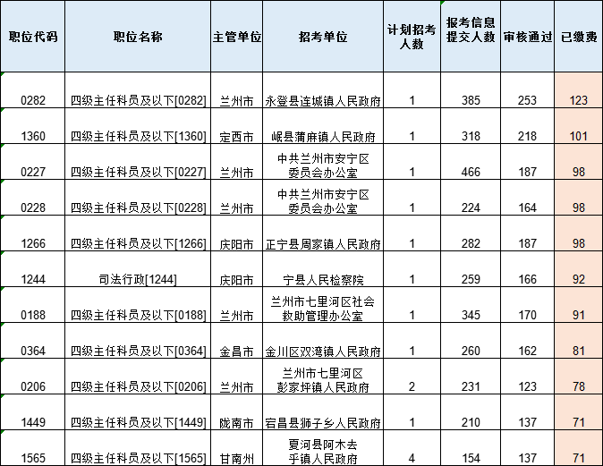 截止2月28日17時(shí),2022年甘肅公務(wù)員考試共有26501人提交報(bào)名,15081人通過審核,8392人繳費(fèi),168個(gè)崗位無人報(bào)考,具體數(shù)據(jù)詳見附件: