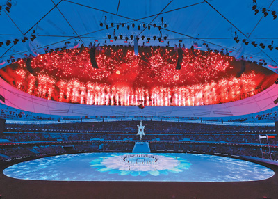 絢麗的焰火騰空而起,點燃了人們心中的激情,體育場內(nèi)一片歡騰。