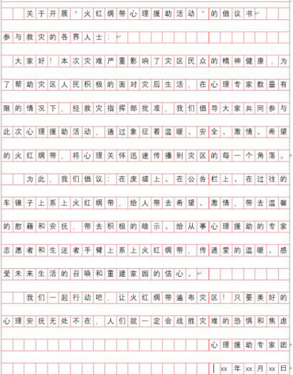 【例題】“給定資料2”中心理援助專家團(tuán)提議開展“火紅綢帶心理援助行動”。假定在某次救災(zāi)工作中,救災(zāi)指揮部決定采納這個提議,請你結(jié)合“給定資料2”,以專家團(tuán)的名義給參與救災(zāi)的各界人士寫一份倡議書。(15分)