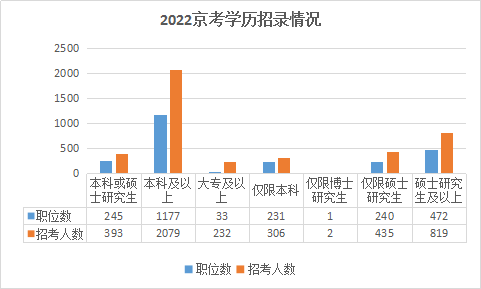 2022北京公務(wù)員考試提供的職位中,學歷要求劃分明細,大專可報職位共有33個,占總職位數(shù)的1.38%,招錄232人,占總招錄人數(shù)的5.44%;本科可報職位共有1686個,占總職位數(shù)的70.28%;碩士研究生可報職位共有2167個,占總職位數(shù)的90.33%;博士研究生可報職位共有1683個,占總職位數(shù)的70.15%;