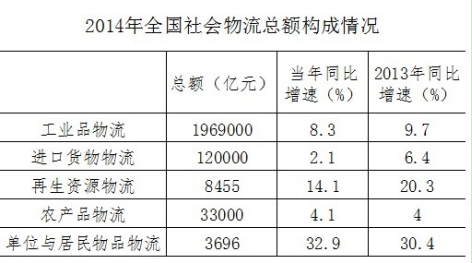 2014年全國(guó)社會(huì)物流總額213.5萬(wàn)億元,同比增長(zhǎng)7.9%,比上年回落1.6個(gè)百分點(diǎn)。