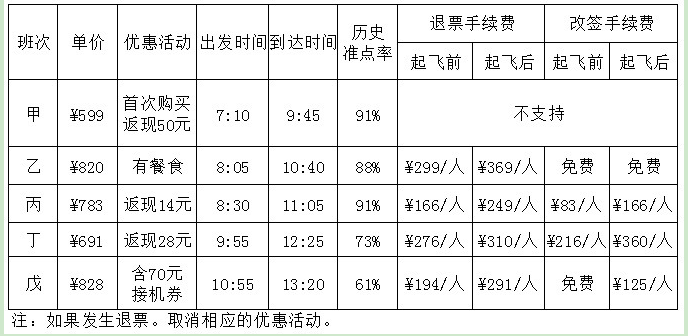 131.5月30日早晨,王先生由于記錯(cuò)了時(shí)間,10︰30到達(dá)機(jī)場(chǎng)時(shí),所購(gòu)班次的飛機(jī)已經(jīng)起飛,幸運(yùn)的是隔天同一班次的機(jī)票還有售,且價(jià)錢不變,于是在窗口辦理了改簽。加上之前網(wǎng)上訂票的費(fèi)用,王先生一共花費(fèi)了900多元,他所購(gòu)買的最可能是哪個(gè)班次的機(jī)票( )。