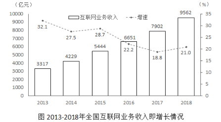 2018年全國(guó)互聯(lián)網(wǎng)業(yè)務(wù)收入9562億元,比上年增長(zhǎng)21.0%。其中,廣東、上海、北京互聯(lián)網(wǎng)業(yè)務(wù)收入分別增長(zhǎng)26.5%、20.0%和25.2%。2018年互聯(lián)網(wǎng)企業(yè)信息服務(wù)收入8594億元,比上年增長(zhǎng)20.7%。其中,電子商務(wù)平臺(tái)收入3667億元,增長(zhǎng)13.1%;網(wǎng)絡(luò)游戲業(yè)務(wù)收入1948億元,增長(zhǎng)17.8%。2018年互聯(lián)網(wǎng)行業(yè)研發(fā)投入490億元,比上年增長(zhǎng)19.0%。
