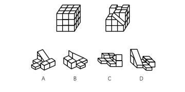 115、如下圖所示,左側(cè)為大立方體,右側(cè)為其部分立體截面,問哪個(gè)選項(xiàng)能夠與其拼成完整的大立方體:( )