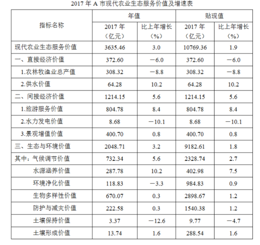 B、2017年A市現(xiàn)代農(nóng)業(yè)生態(tài)服務(wù)價(jià)值年值增長(zhǎng)率、貼現(xiàn)值增長(zhǎng)率最低的是同一個(gè)指標(biāo)