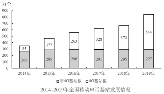 。2014~2019年,全國(guó)移動(dòng)電話(huà)4G及非4G基站數(shù)變化情況如下圖所示: