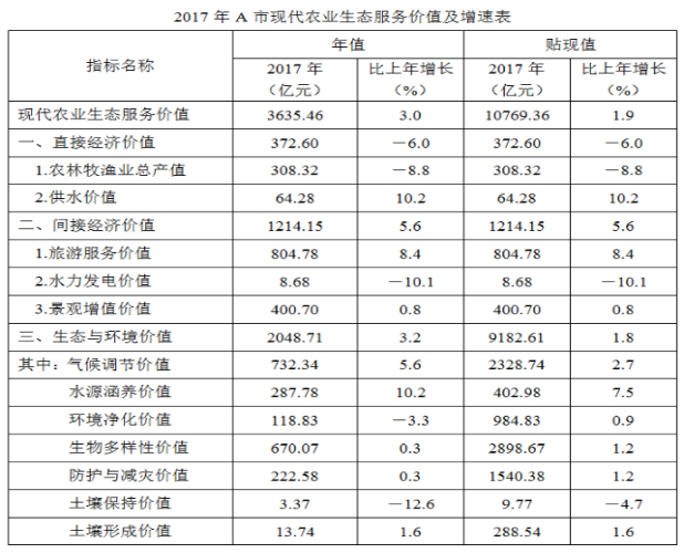 B.2017年A.市現(xiàn)代農(nóng)業(yè)生態(tài)服務(wù)價(jià)值年值增長(zhǎng)率、貼現(xiàn)值增長(zhǎng)率最低的是同一個(gè)指標(biāo)