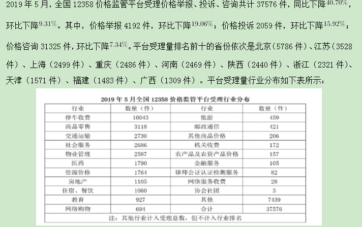 B.2019年5月,平臺(tái)受理價(jià)格咨詢數(shù)量環(huán)比下降幅度最大