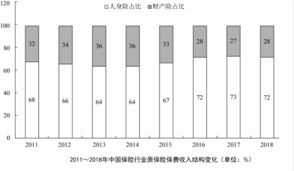2018年,從險(xiǎn)種來看,財(cái)產(chǎn)險(xiǎn)業(yè)務(wù)原保險(xiǎn)保費(fèi)收入10770.08億元,同比增長(zhǎng)9.51%;人身險(xiǎn)原保險(xiǎn)保費(fèi)收入27246.54億元,其中壽險(xiǎn)業(yè)務(wù)原保險(xiǎn)保費(fèi)收入20722.86億元,同比下降3.41%;健康險(xiǎn)業(yè)務(wù)原保險(xiǎn)保費(fèi)收入5448.13億元,同比增長(zhǎng)24.12%;意外險(xiǎn)業(yè)務(wù)原保險(xiǎn)保費(fèi)收入1075.55億元,同比增長(zhǎng)19.33%。從保費(fèi)收入結(jié)構(gòu)來看,人身險(xiǎn)、財(cái)產(chǎn)險(xiǎn)的保費(fèi)占比與上年相比趨于穩(wěn)定。