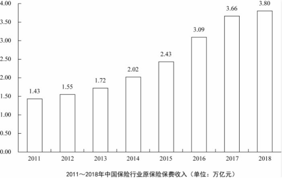 D.2011~2018年,中國(guó)保險(xiǎn)行業(yè)原保險(xiǎn)保費(fèi)收入總計(jì)超過20萬億元