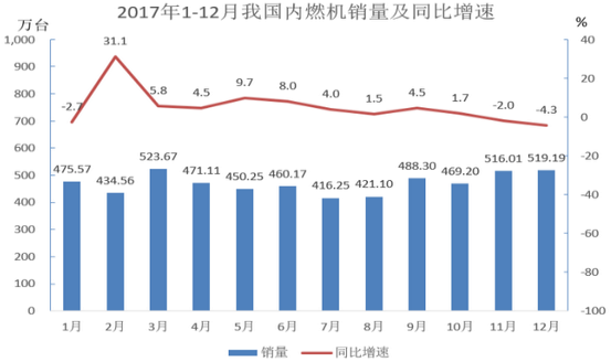 2017年1-12月,全國內(nèi)燃機(jī)累計銷量5645.38萬臺,同比增長4.11%,累計完成功率266879.47萬千瓦,同比增長9.15%,其中柴油內(nèi)燃機(jī)功率同比增長34%。