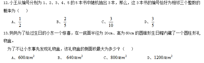20.某商店促銷,購物滿足一定金額可進行摸球抽獎,中獎率100%。規(guī)則如下:抽獎箱中有大小相同的若干個紅球和白球,從中摸出兩個球,如果都是紅球,獲一等獎;如果都是白球,獲二等獎;如果是一紅一白,獲三等獎。假定一、二、三等獎的概率分別為0.1、0.3、0.6,那么抽獎箱中球的個數(shù)為( )