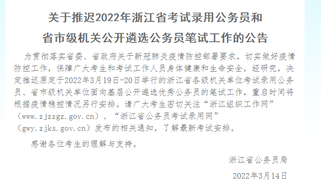 官方通知來啦?。?!因疫情影響,原定3月19-20日舉行的2022年浙江公務員筆試再次延期,具體考試日期另行公布!↓↓↓