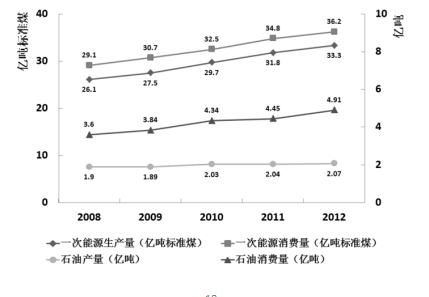 圖1 2008—2012年全國一次能源、石油生產(chǎn)量與消費量的情況