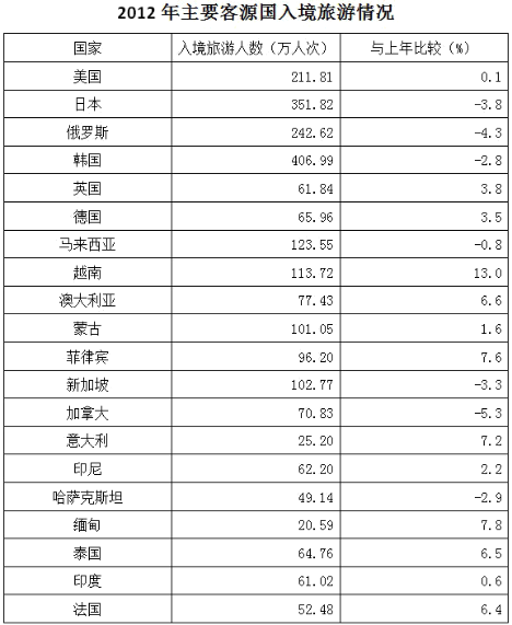 2012年,全國國內(nèi)旅游人數(shù)29.57億人次,比上年增長12.0%。其中,城鎮(zhèn)居民19.33億人次。2012年,全國國內(nèi)旅游收入22706.22億元人民幣,比上年增長17.6%。2012年全年入境外國游客人數(shù)比上年增長0.3%,其中,亞洲市場入境人數(shù)1664.88萬人次,與上年基本持平,占入境外國游客人數(shù)的61.2%;歐洲市場入境人數(shù)592.16萬人次,增長0.2%;美洲市場入境人數(shù)317.95萬人次,減少0.7%;大洋洲市場入境人數(shù)91.49萬人次,增長6.5%;非洲市場入境人數(shù)52.49萬人次,增長7.4%。