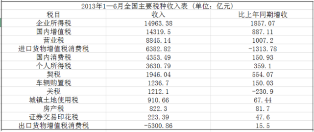 2013年二季度,我國稅收月收入同比增速逐步提高,分別為7.9%、8.3%和12.9%。截至2013年6月,全國稅收總收入完成59260.61億元,同比增長7.9%,較上年同期回落1.9個(gè)百分點(diǎn)。其中,國內(nèi)增值稅、企業(yè)所得稅同比分別增長6.6%和14.2%,較上年同期增速分別回落1.5和3.1個(gè)百分點(diǎn);房產(chǎn)稅同比增長11%,比上年同期增速回落19.1個(gè)百分點(diǎn);進(jìn)口貨物增值稅、消費(fèi)稅和關(guān)稅同比分別下降17.1%和16%,比上年同期增速分別回落24.5和22.9個(gè)百分點(diǎn)。