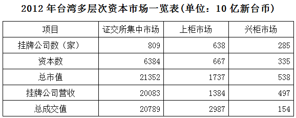臺灣資本市場第三層次為興柜市場。在準(zhǔn)入門檻方面,興柜市場沒有營業(yè)利潤、資本額、設(shè)立年限的限制,只須符合已經(jīng)申報上市或上柜輔導(dǎo)且兩家以上證券商書面推薦。至2012年底,興柜公司285家,資本額0.335兆新臺幣,總市值0.538兆新臺幣。