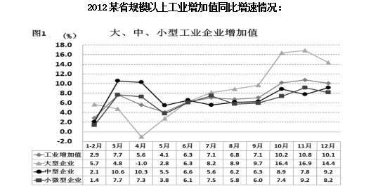 2012年,某省規(guī)模以上工業(yè)增加值10875億元,比上年增長7.1%,月度增速從1-2月的2.9%回升到10-12月的10%以上,大型、中型和小微型企業(yè)增加值分別為3074、3217和4584億元,比上年分別增長8.2%、6.8%和6.7%。
