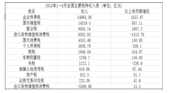 ④2013年我國(guó)上半年企業(yè)所得稅、國(guó)內(nèi)增值稅兩項(xiàng)之和超過(guò)同期稅收總收入的50%