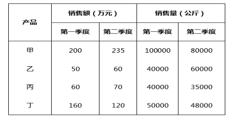 某水產(chǎn)公司共銷售甲、乙、丙、丁四種魚類產(chǎn)品。其在兩個(gè)季度的銷售額和銷售量情況如下: