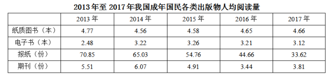 2017年我國(guó)成年國(guó)民圖書閱讀率為59.1%,比上年增加0.3個(gè)百分點(diǎn);報(bào)紙閱讀率為37.6%,比上年降低2.1個(gè)百分點(diǎn);期刊閱讀率為25.3%,比上年增加1個(gè)百分點(diǎn)。