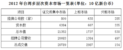 臺(tái)灣資本市場(chǎng)第三層次為興柜市場(chǎng)。在準(zhǔn)入門(mén)檻方面,興柜市場(chǎng)沒(méi)有營(yíng)業(yè)利潤(rùn)、資本額、設(shè)立年限的限制,只須符合已經(jīng)申報(bào)上市或上柜輔導(dǎo)且兩家以上證券商書(shū)面推薦。至2012年底,興柜公司285家,資本額0.335兆新臺(tái)幣,總市值0.538兆新臺(tái)幣。