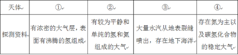 13.“旅行者1號(hào)”空間探測(cè)器經(jīng)過(guò)36年的人類星際探索,沿途探索①木星②土星③土衛(wèi)二④土衛(wèi)六是否存在生命跡象,并發(fā)回資料。閱讀表格,依據(jù)探測(cè)資料判斷將來(lái)最有可能孕育生命的天體是( )