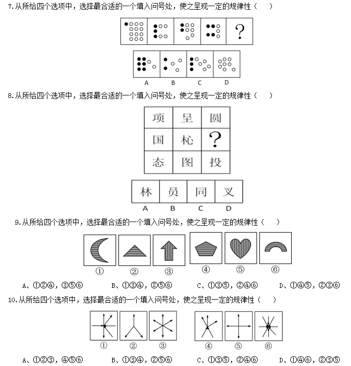 6.從所給四個(gè)選項(xiàng)中,選擇最合適的一個(gè)填入問(wèn)號(hào)處,使之呈現(xiàn)一定的規(guī)律性( )