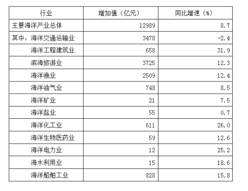 2009年全國海洋生產(chǎn)總值31964億元,比上年增長8.6%。全國海洋生產(chǎn)總值占國內(nèi)生產(chǎn)總值的9.53%,占沿海地區(qū)生產(chǎn)總值的15.5%。海洋第一產(chǎn)業(yè)增加值1879億元,海洋第二產(chǎn)業(yè)增加值15062億元,海洋第三產(chǎn)業(yè)增加值15023億元。